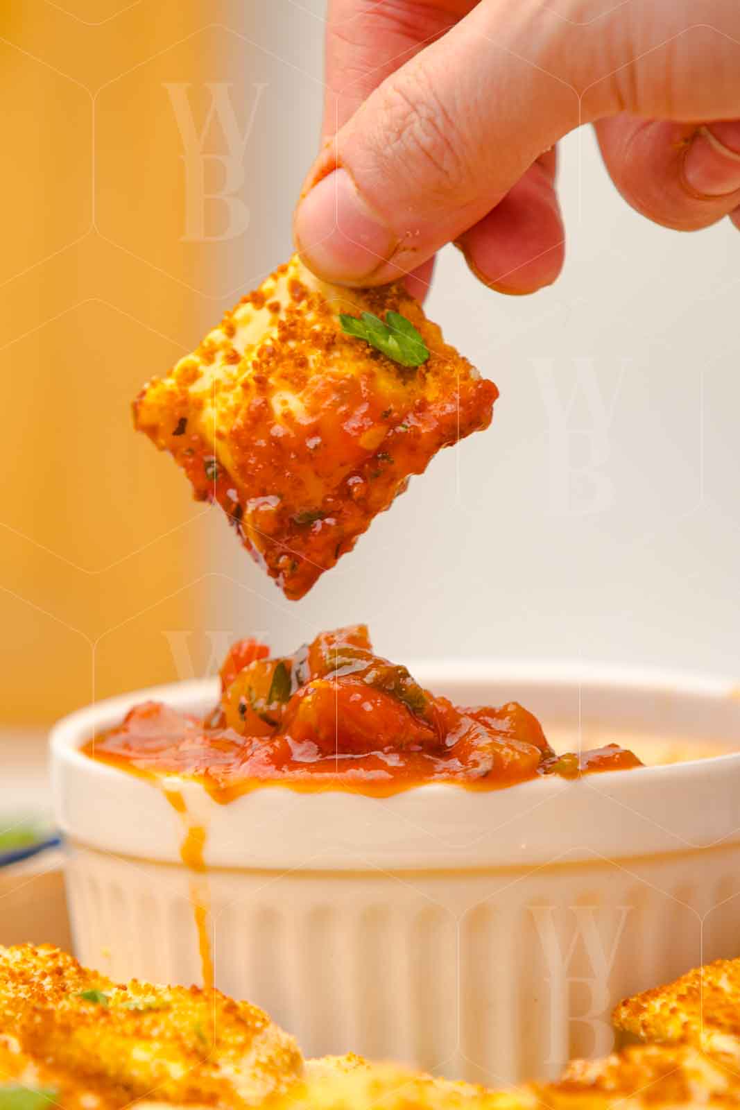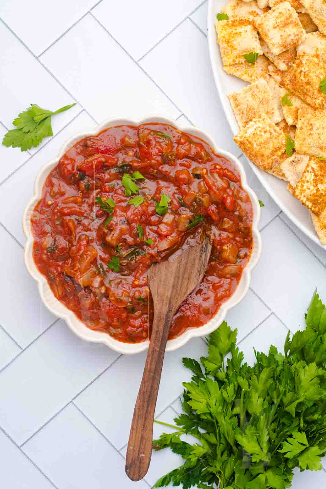 Frozen ravioli – egg – panko – parmesan cheese – fresh parsley – olive oil – canned tomatoes -garlic – onion – oregano – salt – tomatoe paste