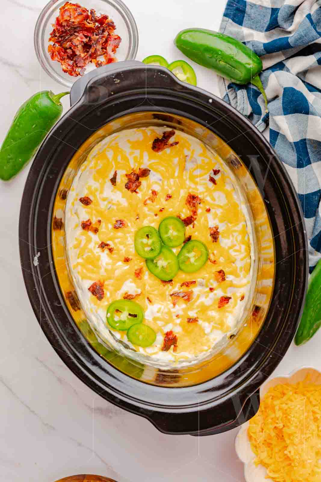 Cheddar cheese – Jalapenos – Cream Cheese- Sour Cream – Monterrey Jack Cheese or mexican blend – Bacon –