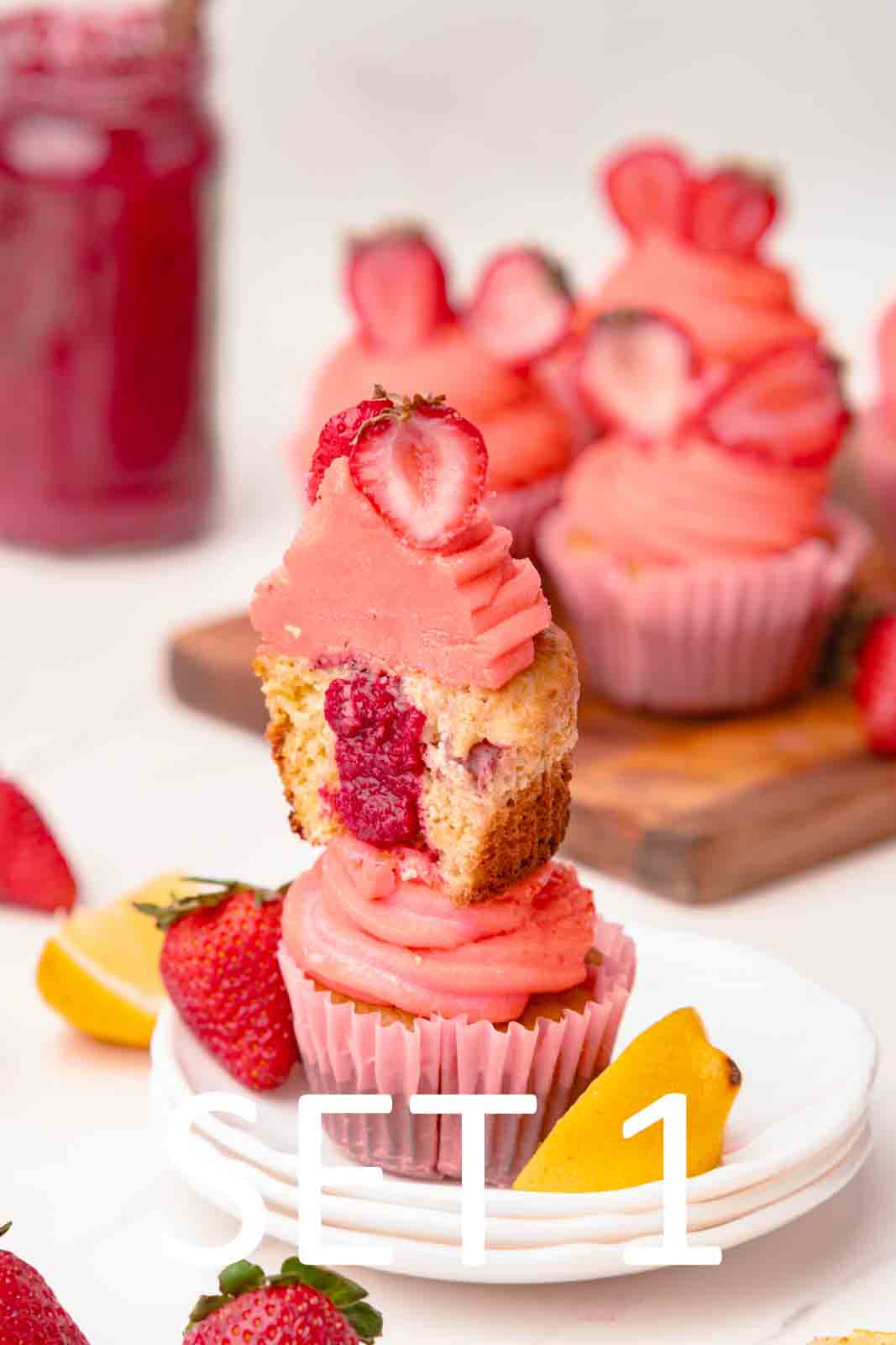 All Purpoe flour – Baking Powder – granulated Sugar – eggs – Vanilla Milk – Lemon zest – Lemon juice – Melted butter – Powdered sugar – Strawberry jam